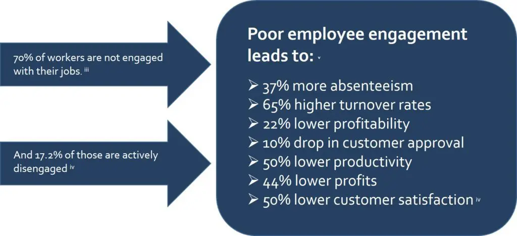 - Companies with low engagement report 44% lower profits, 37% higher absenteeism, 25% higher turnover, 28% more thefts, 41% more safety incidents and 50% lower customer satisfaction.