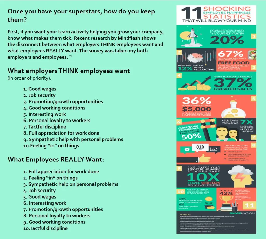 Every company is different and the culture should match the values of the superstars you have and that you want to attract. Invest time and resources in developing yours. Let your superstars help you lead in developing a healthy, vibrant culture. Spend time in knowing and enjoying co-workers as people with group and/or team building activities. 92% of employees rate both their overall corporate culture and teamwork within their department as important to them.[viii] And 88% say that they place high value on their relationships with co-workers.[ix]